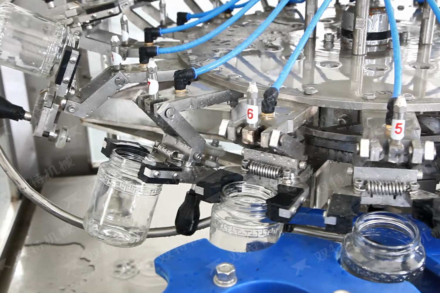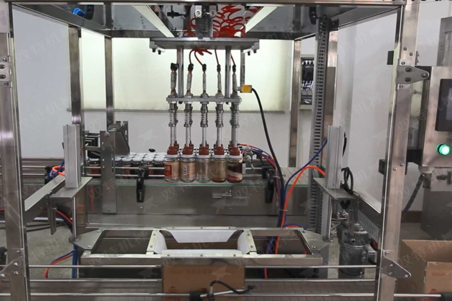 旋蓋機主要用于玻璃廣口瓶的三、四、六鐵蓋真空旋蓋,用兩根不同速度的皮帶壓瓶蓋,因兩根皮帶的速度不同,對蓋進行搓蓋收緊達到旋蓋目的。在自動上蓋之前對瓶口吹蒸汽加熱,吹掉冷空氣,換上高溫蒸汽,立即旋蓋,根據熱脹冷縮原理,蒸汽冷下來就自然形成了瓶內真空,達到了真空旋蓋的目的。自動旋蓋機可以和濃醬灌裝機、蜂蜜灌裝機、辣椒醬灌裝機組合在一起,形成一套全自動灌裝設備,是現代調味品企業的得力幫手。
